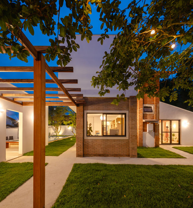 Para o 4º e último movimento, a nova construção da churrasqueira, banheiro e quarto foi posicionada seguindo os alinhamentos da casa principal, que está posicionada de viés no terreno irregular, de forma a criar 2 grandes jardins, contrapondo as áreas construídas. Todas as aberturas se voltam para os jardins, criando um jogo de cheio e vazio, dentro e fora que fazem a casa se misturar aos jardins que contam com pés de Graviola, Pitanga e outras árvores frutíferas.